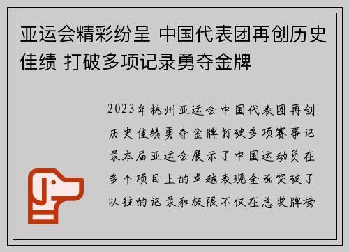 亚运会精彩纷呈 中国代表团再创历史佳绩 打破多项记录勇夺金牌